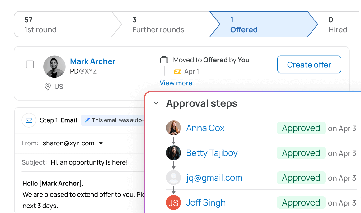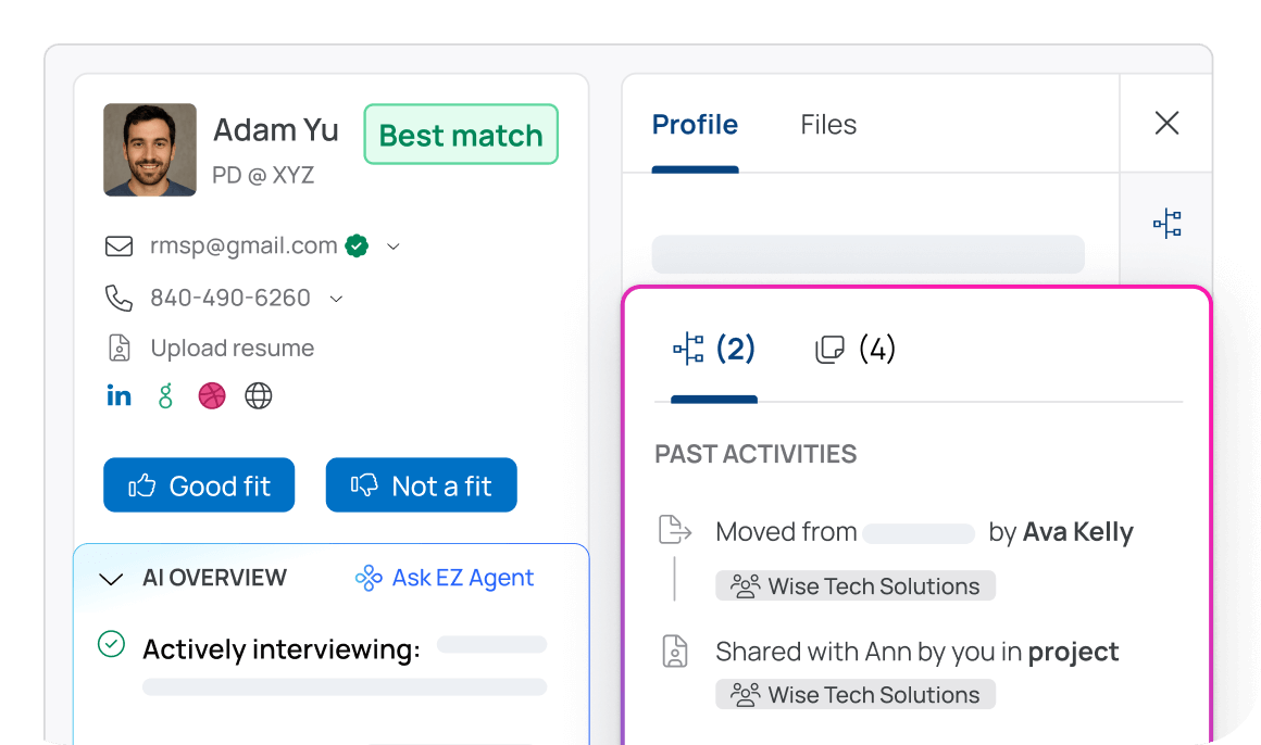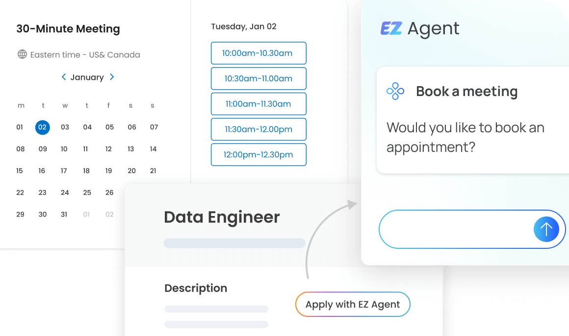 Candidates are guided from job discovery to interview scheduling in one conversational flow. EZ Agent qualifies talent, answers job-specific questions, and keeps applicants engaged.
