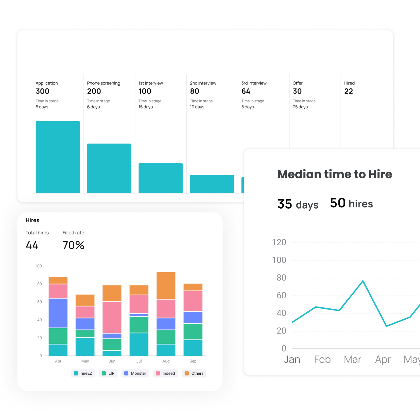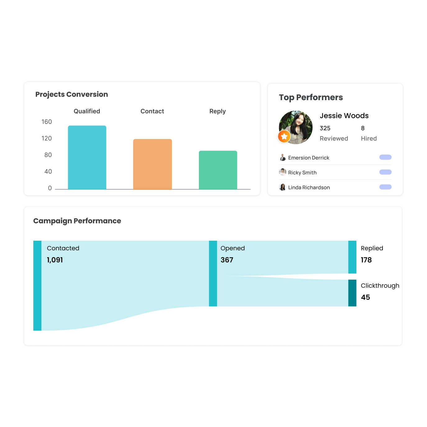 Custom dashboards and automated reports let you monitor recruiter adoption, conversion rates, and hiring outcomes across teams and geographies.